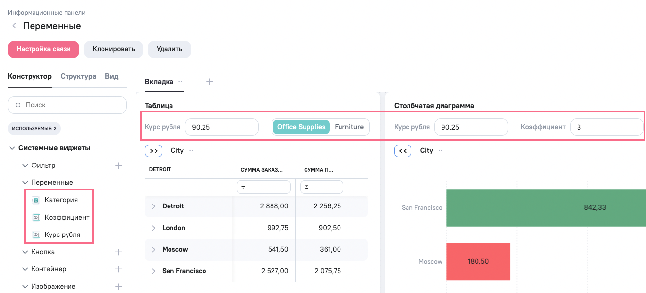 создание системных виджетов: фильтры, кнопки, контейнеры, изображения, переменные, текста;