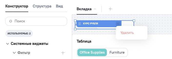 - Удалить - виджет удаляется из области редактирования и из списка виджетов. Если виджет содержит в себе объекты, то при удалении появится окно подтверждения действия.