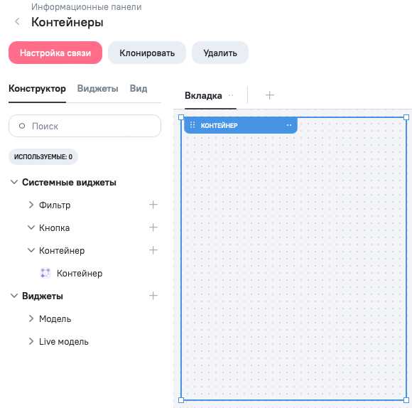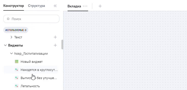 Добавить ранее созданный виджет на панель можно переносом с вкладки Конструктор с помощью drag-and-drop в рабочую область панели.