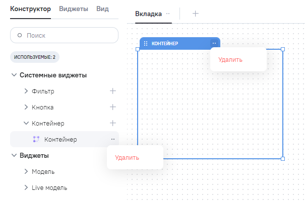 При наведении на виджет Контейнер на информационной панели или на вкладке Конструктор и открытии меню по кнопке доступно: