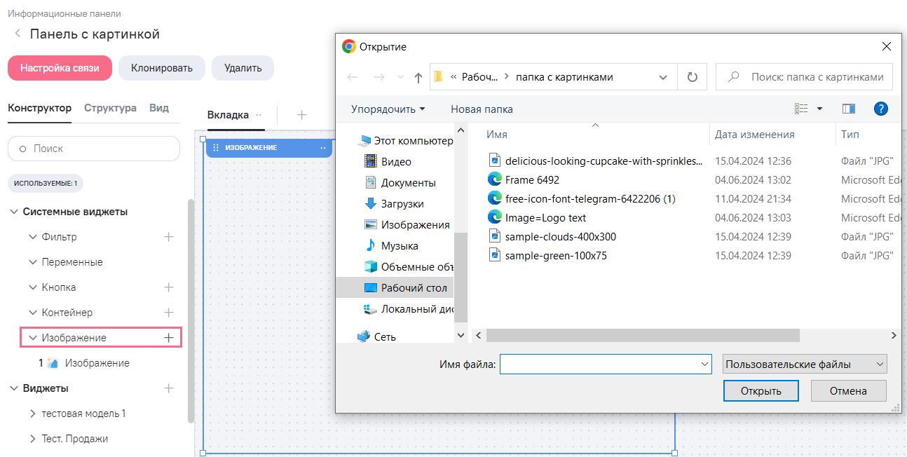 Системный виджет Изображение позволяет разместить на панели логотипы и другие изображения. Список изображений отображается на вкладке Конструктор в блоке Изображение.