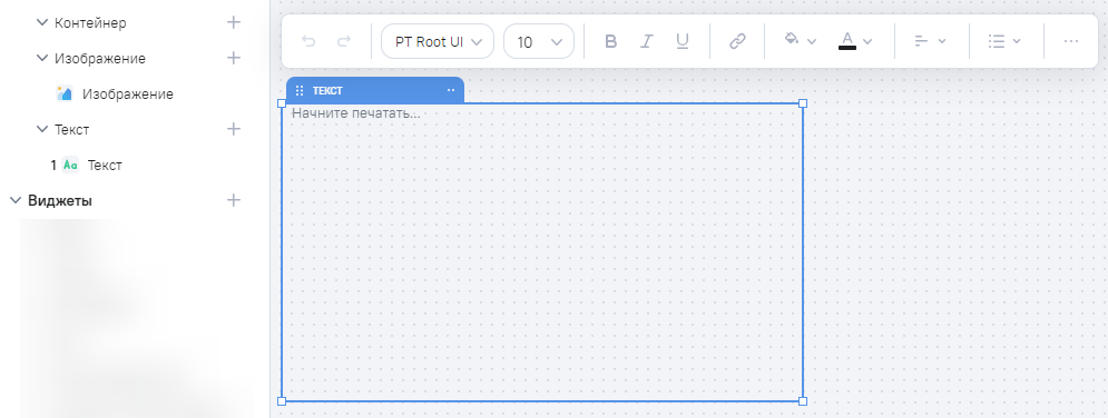 - клик на область виджета - появляется синяя обводка виджета, плашка с наименованием и кнопкой меню, маркеры изменения размеров. Для сброса фокуса нажмите в свободное место в области в рабочей области или нажмите на кнопку Esc на клавиатуре;