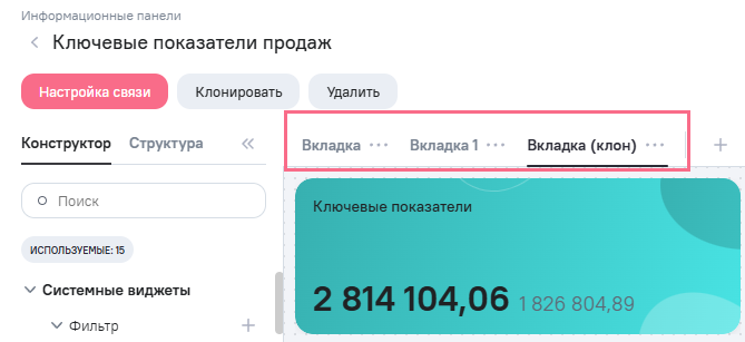 Клонировать - создается клон системного виджета, он автоматически добавляется на область информационной панели. В названии фильтра будет добавляться слово (клон);