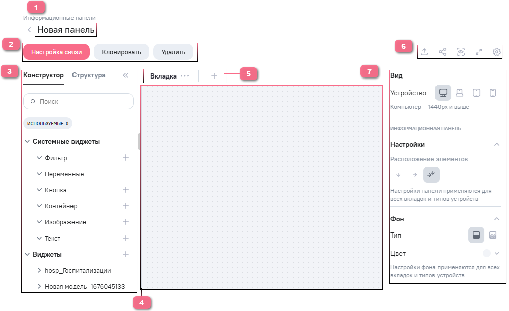 Операции редактирования новой информационной панели аналогичны операциям при создании уже существующей и представляют собой выбор добавляемых на панель виджетов, их размещение и упорядочивание на рабочей области панели.