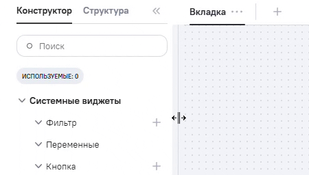 Панель с вкладками Конструктор и Структура скрывается по нажатию на кнопку svg Свернуть. При скрытии блока слева появляется навигационная кнопка img Конструктор, при нажатии на которую панель снова раскроется.