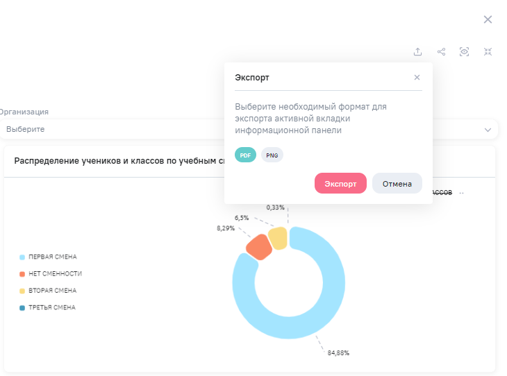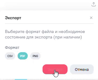 При наличии у пользователя права на экспорт информационной панели в окне просмотра и редактирования, а также при переходе по прямой ссылке на информационную панель отобразится кнопка Экспорт. При нажатии на кнопку в выпадающем списке отобразятся варианты формата выгрузки: PDF или PNG.