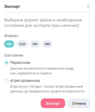 Для экспорта данных виджета в файл формата .csv нажмите на кнопку в режиме редактирования или просмотра виджета. Окно настройки экспорта содержит: