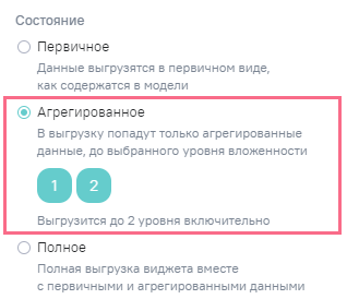 Агрегированное - для экспорта агрегированных данных, после выбора данного состояния отобразятся доступные уровни вложенности. Выберите необходимый уровень вложенности, до которого включительно будет выполняться выгрузка, начиная с первого;