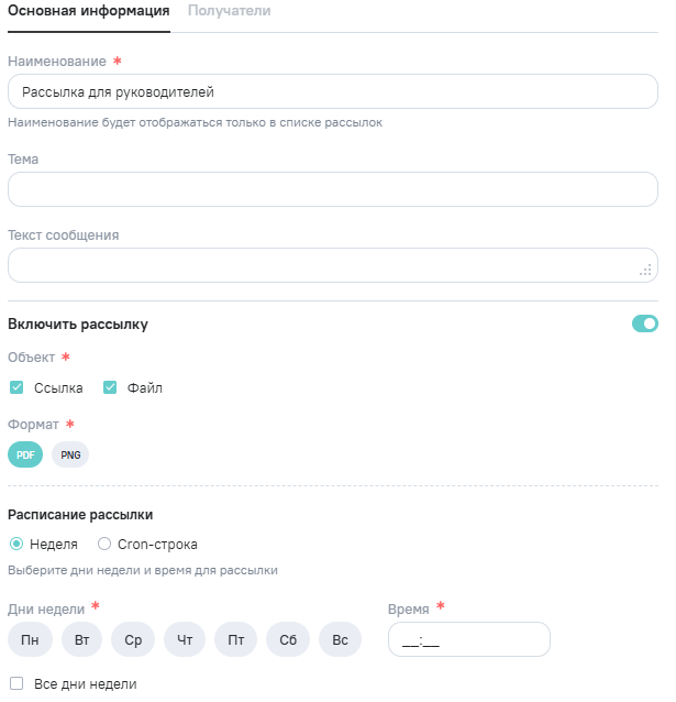 Окно состоит из двух вкладок: Основная информация и Получатели. Вкладка Получатели будет недоступна до создания рассылки.
