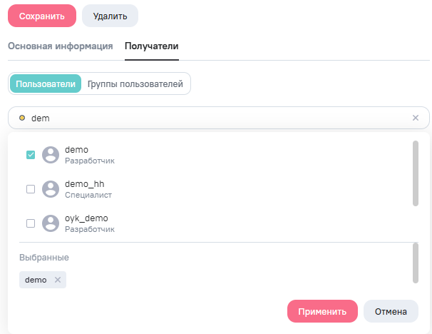 Чтобы определить список конкретных получателей в режиме Получатели нажмите на поле Выберите пользователей, отобразится список активных пользователей Системы. Начните вводить логин, список будет отфильтрован по заданному критерию. Чтобы выбрать получателей, установите флажки напротив них, все отмеченные пользователи отобразятся в блоке Выбранные.