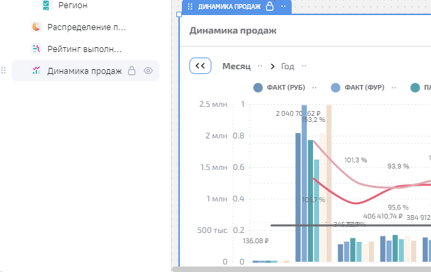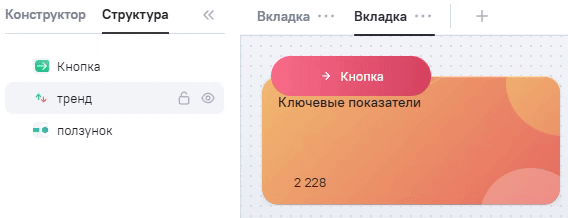Заблокировать - доступна справа от наименования виджета при наведении. По нажатию на кнопку для виджета блокируется: изменение размера, изменение расположения, открытие меню действий. У заблокированного виджета на вкладке Структура и в рабочей области панели отображается