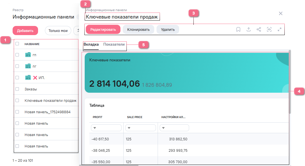 Чтобы перейти из реестра объектов информационных панелей к просмотру панели выполните одно из действий: