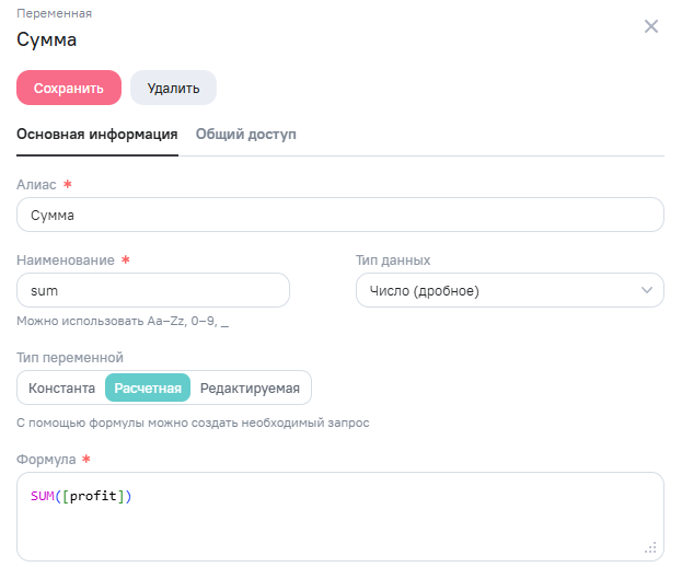 как Расчетная - это изменяемая величина, значение которой рассчитывается с помощью формулы. Подробнее о синтаксисе в разделе Справочник функций