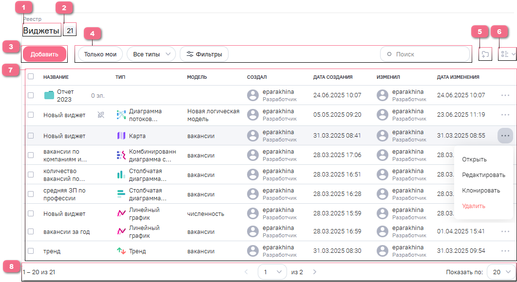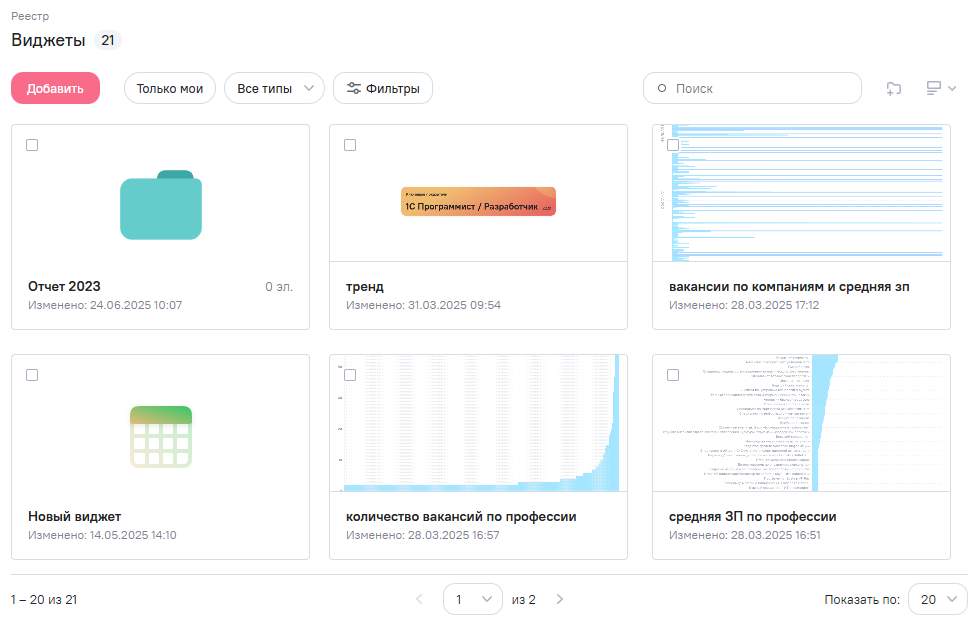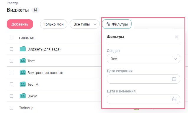 При наличии доступных пользователю виджетов или каталогов отображается реестр объектов виджетов, который содержит следующие элементы интерфейса: