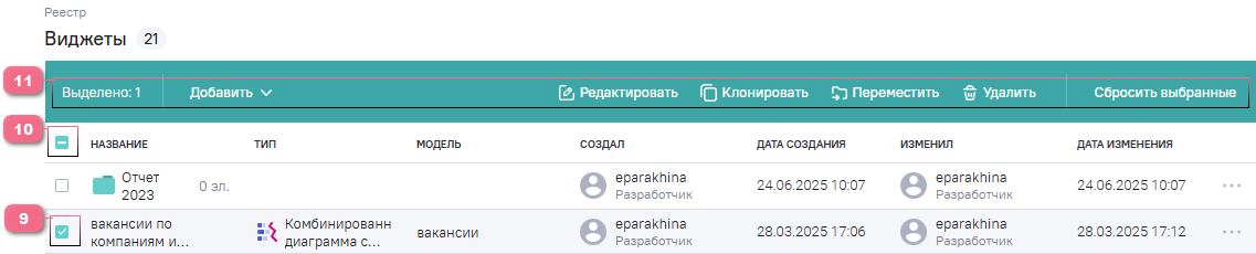 11.Панель для выполнения действий над выбранными виджетами или каталогами - появляется при выборе одного или нескольких виджетов/каталогов. Содержит следующие элементы: