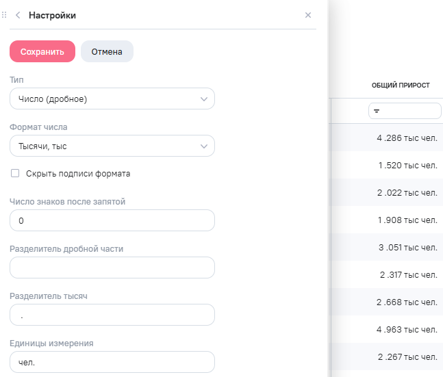 Настройка Скрыть подписи формата доступна при установке значения Тысячи, тыс