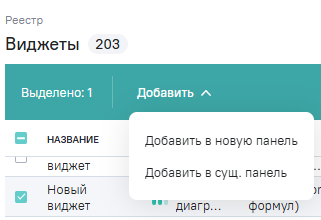 Добавить в новую панель - выполняется одновременное создание новой информационной панели и добавление в нее выбранных виджетов (при наличии у пользователя прав на работу с информационными панелями);