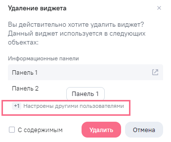 Если для виджета созданы связанные объекты другими пользователями, то при удалении отобразится количество таких объектов в блоке Настроены другими пользователями. Объекты созданные другими пользователями не удалятся даже с включенной опцией С содержимым.