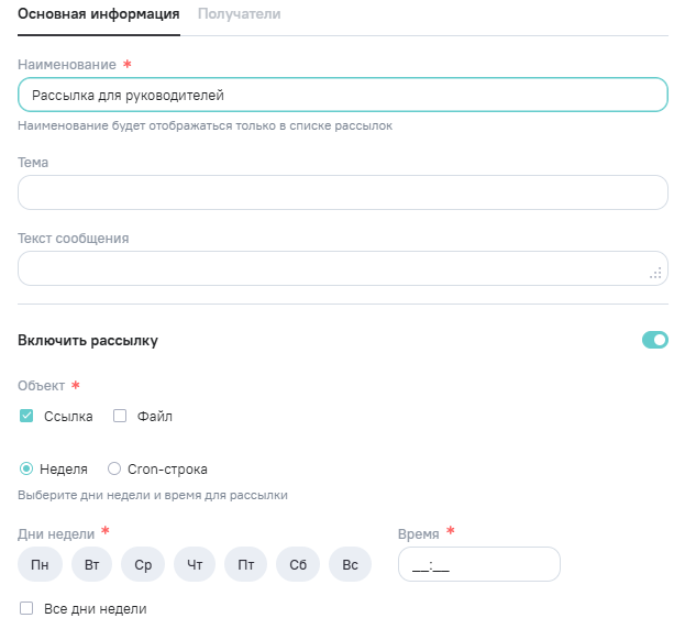 Окно состоит из двух вкладок: Основная информация и Получатели. Вкладка Получатели будет недоступна до создания рассылки.