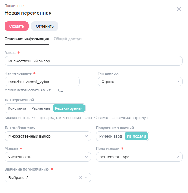Откроется окно создания переменной. Окно состоит из двух вкладок: Основная информация и Общий доступ. Вкладка Общий доступ доступна только после заполнения полей на вкладке Основная информация и нажатия на кнопку Создать.