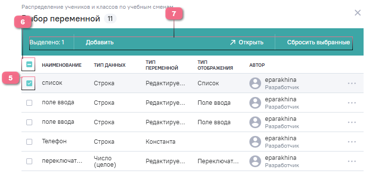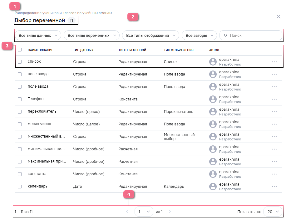 Все созданные в системе переменные попадают в реестр переменных для возможности дальнейшего переиспользования их в других виджетах, в реестре отображаются все доступные пользователю переменные.