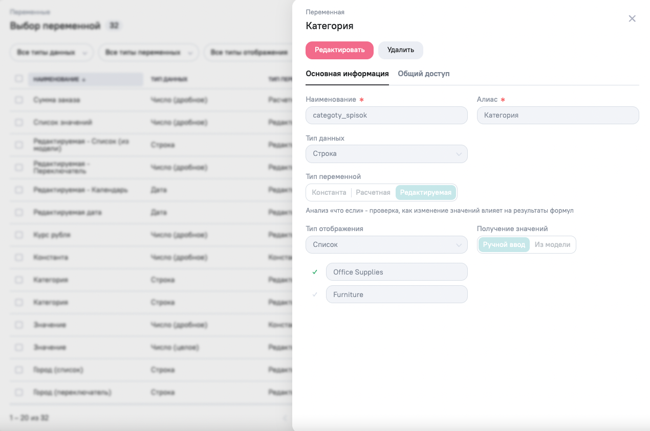 Для удаления переменной наведите курсор мыши на наименование переменной и нажмите на кнопку . В появившемся меню выберите Редактировать или Открыть.