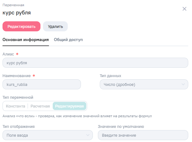 В редактировании переменной можно внести изменения на вкладке Основная информация и Общий доступ. Для сохранения изменений необходимо нажать на кнопку Сохранить.
