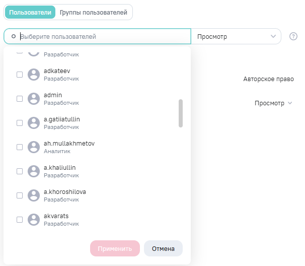 2.напротив необходимого пользователя или группы нажмите на кнопку и выберите новое право доступа.