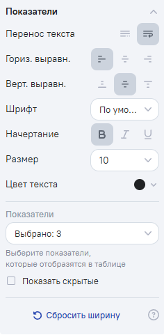 • img Показать скрытые - при нажатии включает/выключает отображение скрытых показателей в режиме редактирования виджета. По умолчанию настройка выключена - скрытые показатели не отображаются;