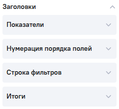 Блок настроек Заголовки включает следующие разделы: Показатели, Нумерация порядка полей, Итоги.